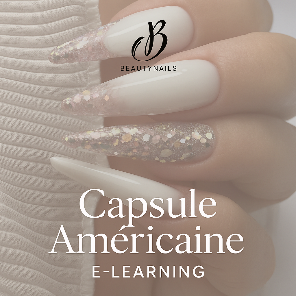 Découvrez une méthode complète et professionnelle pour maîtriser la pose de capsules américaines. Dans ce programme en ligne, vous apprendrez toutes les étapes essentielles : la préparation de l’ongle, comment bien choisir sa capsule, la pose de capsule, la réalisation d’un baby glitter, l’incrustation de paillettes, la pose parfaite de la couleur ainsi qu’une dépose propre qui respecte l’ongle de la cliente.